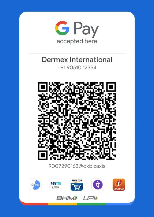C) If you have a smart phone you can make payment through Google Pay App: You have to select the tab “New payment” & select the tab “Phone Number” then type the no: 9051012354 elect tab “verify” (you will see the name Dermex International) & select tab “Pay”, then type the amount in the relevant box and complete the payment process.